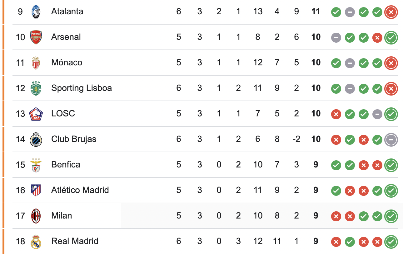 Con este resultado, Real Madrid llegó a 9 puntos y ocupa el puesto 18; en tanto, Atalanta con 11 unidades está en la novena posición, cuando restan sólo dos encuentros para el final de la primera fase.