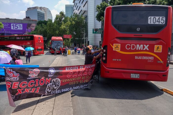 Representantes de la Coordinadora Nacional de Trabajadores de la Educación (CNTE) instalaron varios bloqueos en distintos puntos de la avenida Paseo de la Reforma, en la Ciudad de México, en protesta contra el gobierno federal por no atender sus demandas.