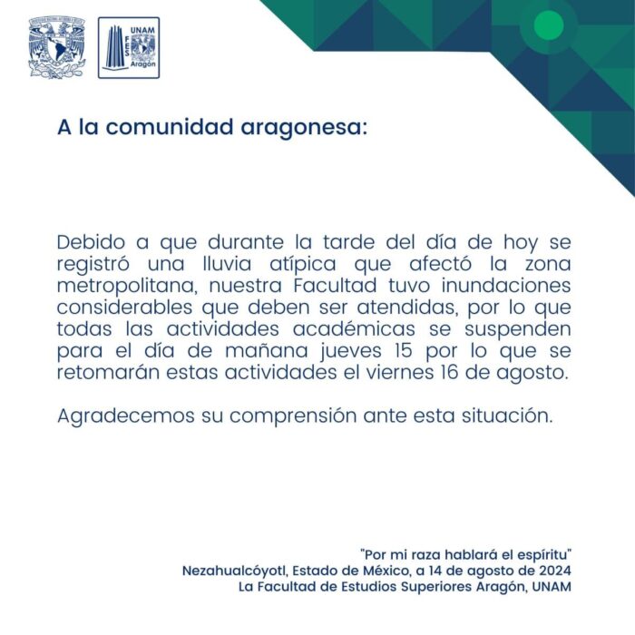 La Facultad de Estudios Superiores (FES) Aragón, que forma parte de la Universidad Nacional Autónoma de México (UNAM) suspendió clases este 15 de agosto debido debido a que la lluvia que se registró la tarde del miércoles y que provocó graves afectaciones a esa zona, incluyendo a las instalaciones educativas.