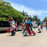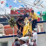 A su paso se fueron sumando lanchas y botes, mientras que en los costados de la travesía, danzantes con sus coloridos vestuarios, cantaban y bailaban a la Patrona de Los Pescadores.