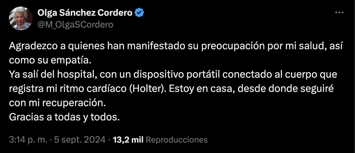 En un mensaje en X –antes Twitter–, Sánchez Cordero dijo que continuará con su recuperación en casa y que, por ahora, usará un “holter”, es decir, un dispositivo encargado de monitorear su ritmo cardiaco.